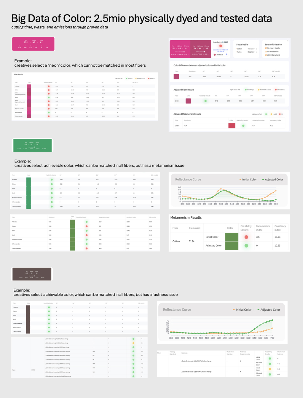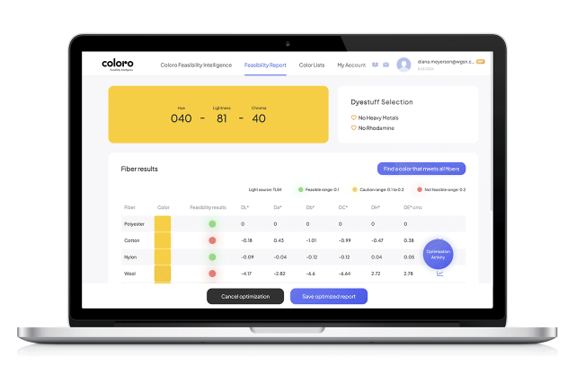 running automated color health checks and optimizations for proven fiber and feasibility results with proven KISCO dyestuff formulations - Coloro Sustainability Intelligence (module to CFI)